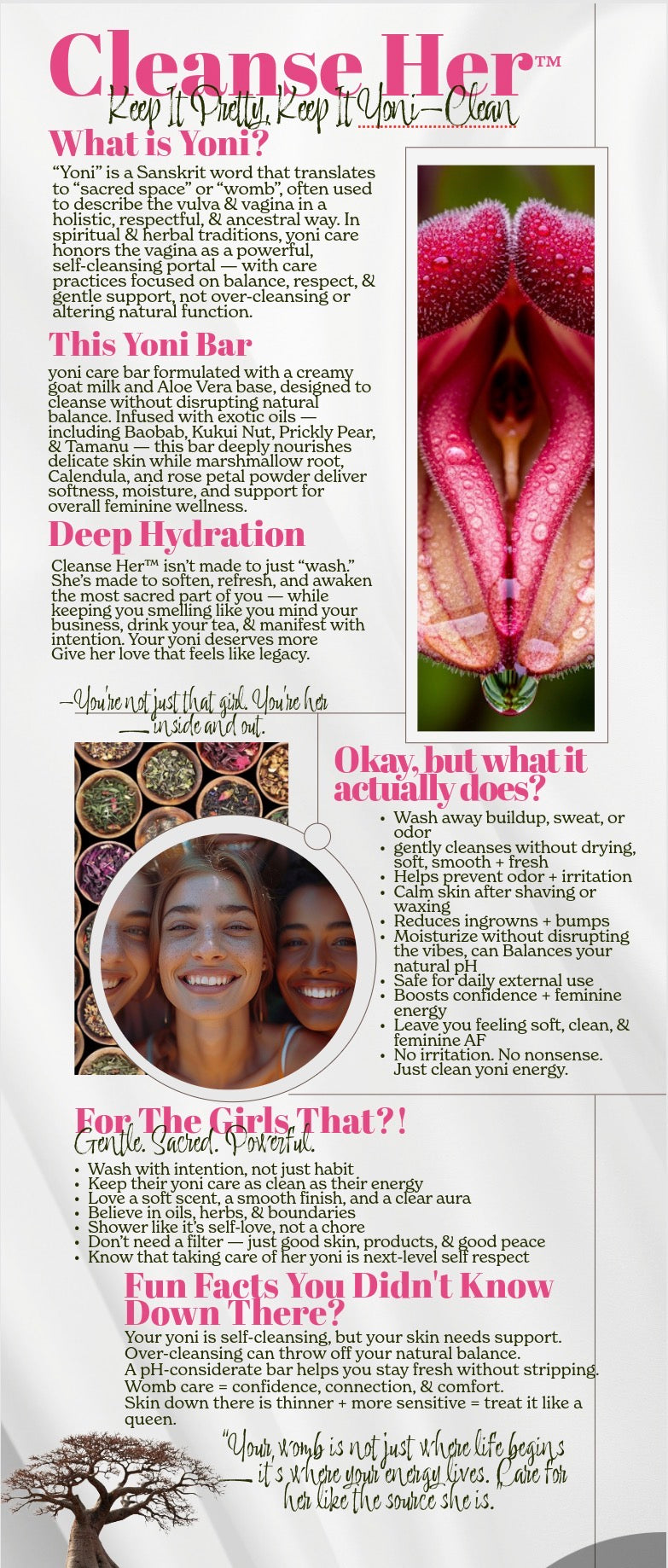 Cleanse Her is a Yoni bar, “yoni” is a Sanskrit word that translates to “sacred space” or “womb” used to describe vulva / vagina in a holistic, respectful & ancestral way. In spiritual & herbal traditions Yoni care honors the vagina as a powerful, selt-cleansing portal - with care practices focused on balance, respect, & alerting natural function .